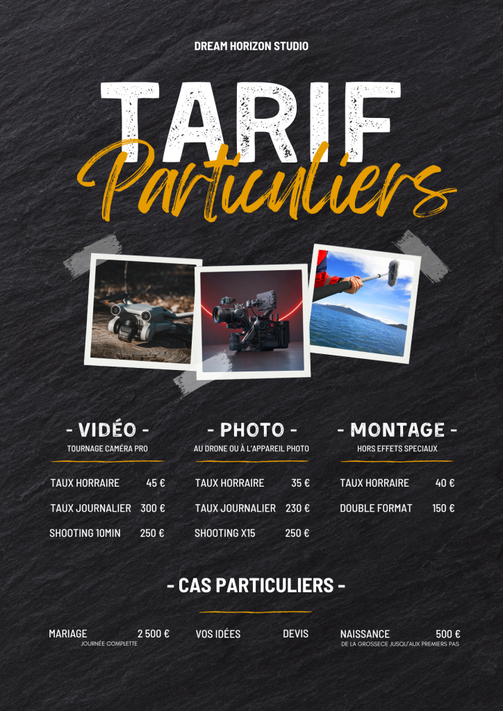 Parce que chaque instant mérite d’être immortalisé, Dream Horizon Studio vous accompagne pour capturer vos plus beaux souvenirs en vidéo et en photo. Que ce soit pour un mariage, un anniversaire, un clip personnel ou une vidéo souvenir, nous mettons notre passion et notre savoir-faire à votre service.